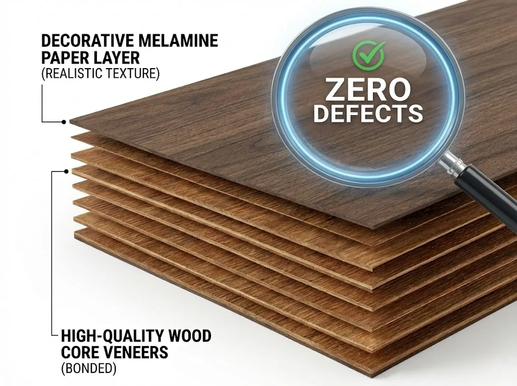 Quality begins at the core. We rigorously select BB-grade or higher eucalyptus/birch veneers, controlling moisture content between 8-12% to prevent warping. For the surface, we utilize A+ grade virgin wood pulp papers from top global suppliers (like Schattdecor/Impress). Through our fully automated impregnation line, we ensure precise resin content for vivid colors, high scratch resistance (>350 rpm), and a flawless finish free from knots, cracks, or wet blooms.